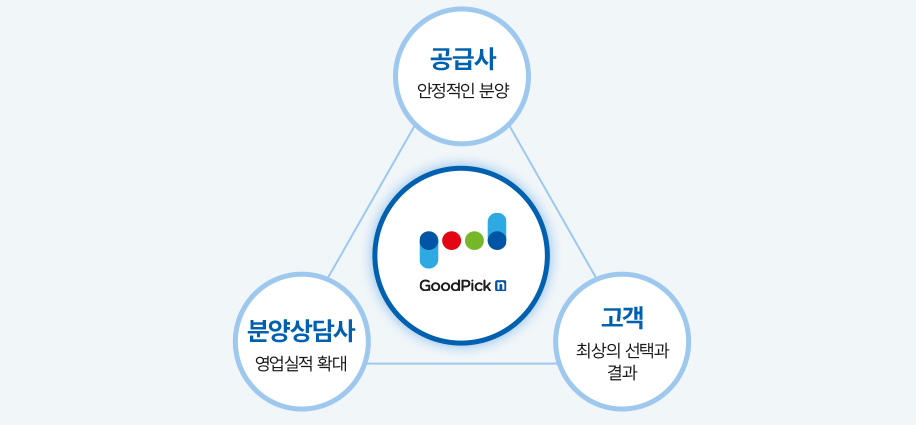 우리는 부동산 중개서비스를 합니다.기업과 기업, 기업과 사람, 사람과 사람을 잇는 일을 합니다.서로가 튼튼하게 잘 이어질 수 있도록 하는 일, 우리가 잘하는 일입니다.쌓아온 경험과 지식을 바탕으로 부동산 시장 상황을 진단하고,부동산 콘텐츠 개발 및 공급을 통해 변화하는 부동산 시장 환경에 先 대응하여고객에게 다양한 선택과 만족을 드리고자 주식회사 굿픽으로 새롭게 태어났습니다.혁신을 통한 부동산 시장의 변화를 위해 언제나 노력하겠습니다. -